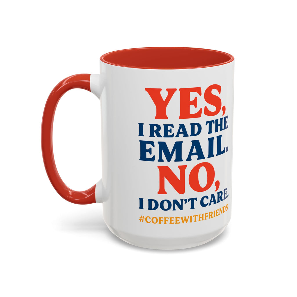 Bring some humor to your workday with the Yes I Read The Email No I Don’t Care coffee mug. This 15oz ceramic cup is perfect for anyone who wants to make a bold statement during meetings or at their desk. The red handle and interior add a sharp pop of color to your daily coffee routine.